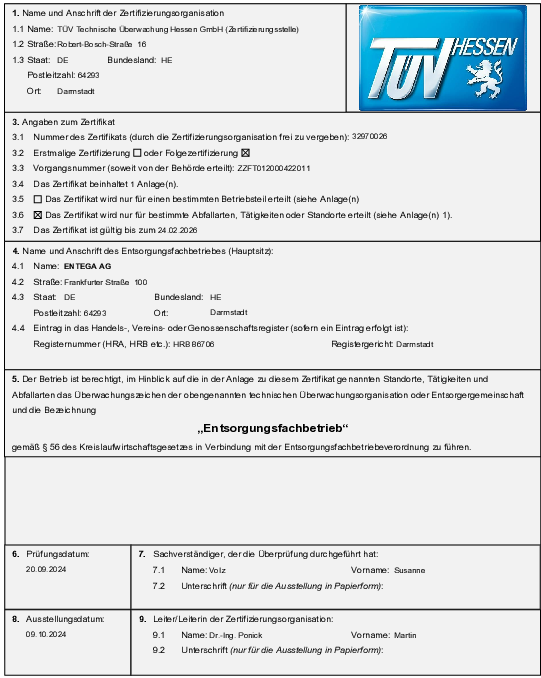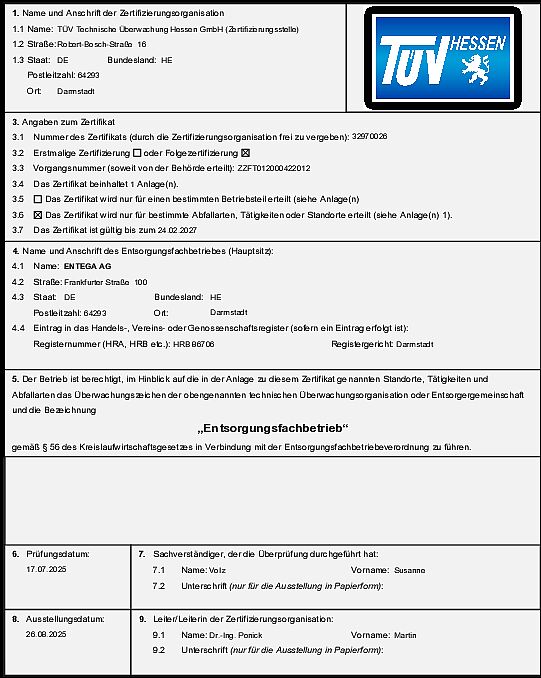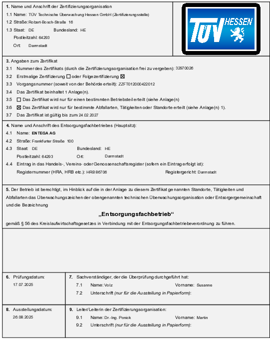 Das nachfolgende vorläufige Zertifikat bestätigt, dass das MHKW Darmstadt allen verwaltungsrechtlichen Anforderungen gerecht wird.