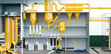Die komplette (nasse und trockene) Rauchgasreinigungsanlage nimmt mehr als zwei Drittel des gesamten Müllheizkraftwerks ein. In der trockenen Rauchgasreinigung werden die Rauchgase von ihren festen Bestandteilen weitestgehend befreit. Die vom Kessel kommenden Rauchgase durchströmen zuerst zwei parallel geschaltete Zyklone. In diesen Fliehkraftabscheidern setzen sich schwerere Staubpartikel außen ab und rutschen zu Boden. Dann durchströmen die Rauchgase einen Sprühabsorber. Hier wird eine feststoffreiche Flüssigkeit eingedüst. Das Wasser verdampft in Rauchgas und die Feststoffe werden trocken abgeschieden. Eine weitere Stufe der trockenen Rauchgasreinigung ist der Elektrofilter, in dem die festen Partikel mittels eines elektrischen Feldes geladen und später abgeschieden werden. Trogkettenförderer transportieren die in den Zyklonen, dem Sprühtrockner und dem Elektrofilter abgeschiedenen Partikel in Reststoffsilos. Von dort werden die Reststoffe in Silofahrzeuge verladen. Diese Reststoffe werden in Salzbergwerken verwertet, indem sie die Hohlräume in Salzstätten auffüllen und diese vor dem Einsturz sichern.